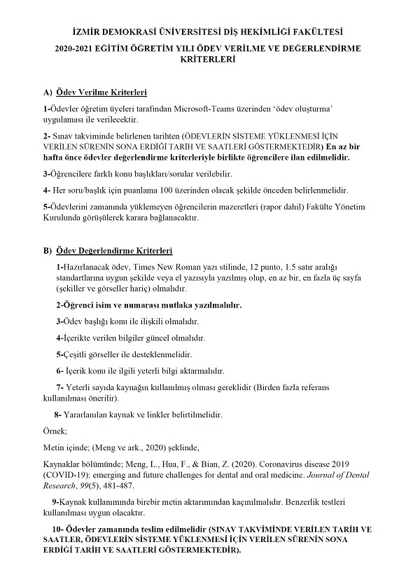 2020-2021 Eğitim- Öğretim Dönemi Diş Hekimliği Fakültesi Ödev Verme ve Değerlendirme Kriterleri